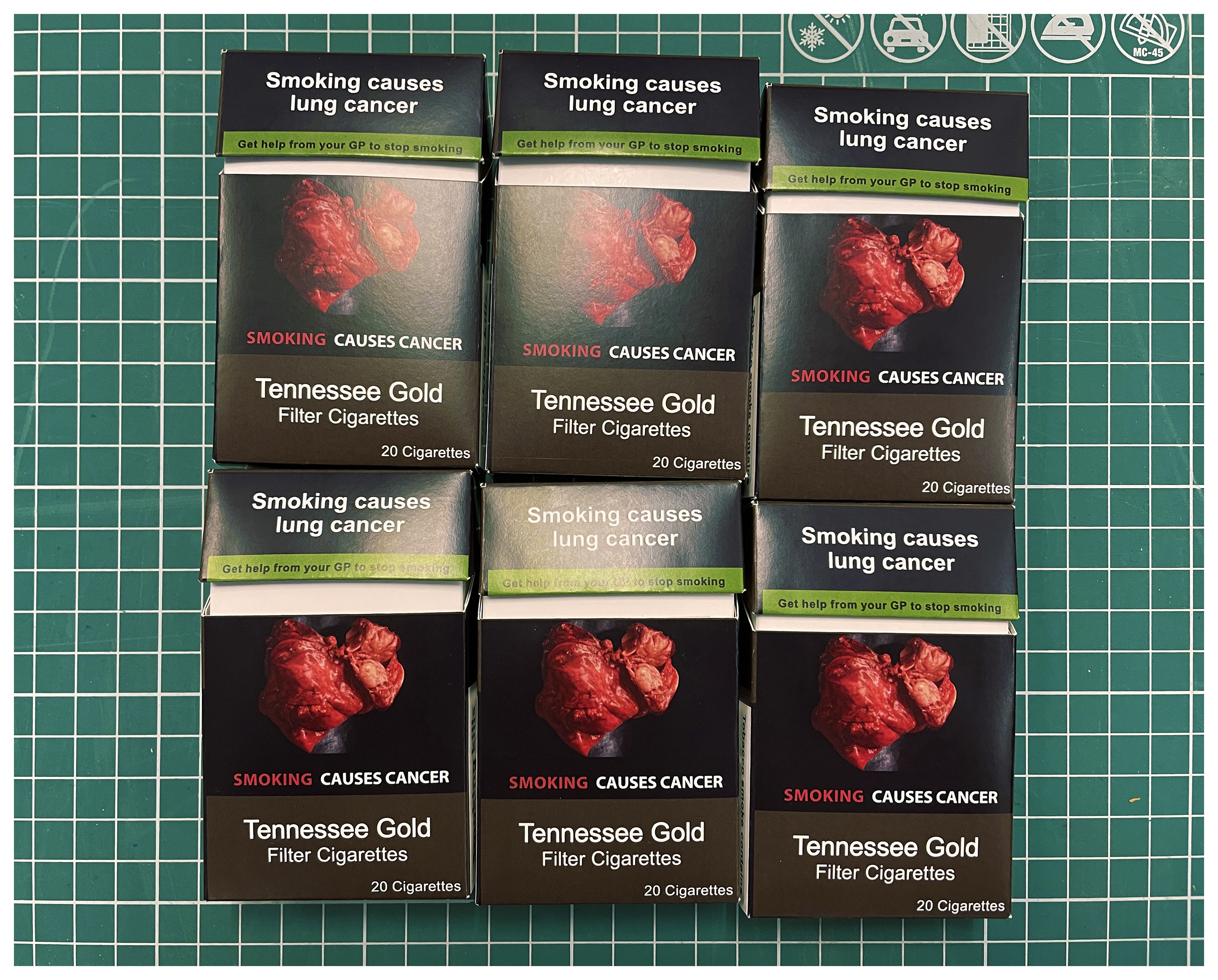 Cigarette packets, filter tips, match boxes, rolling papers, tobacco pouches.