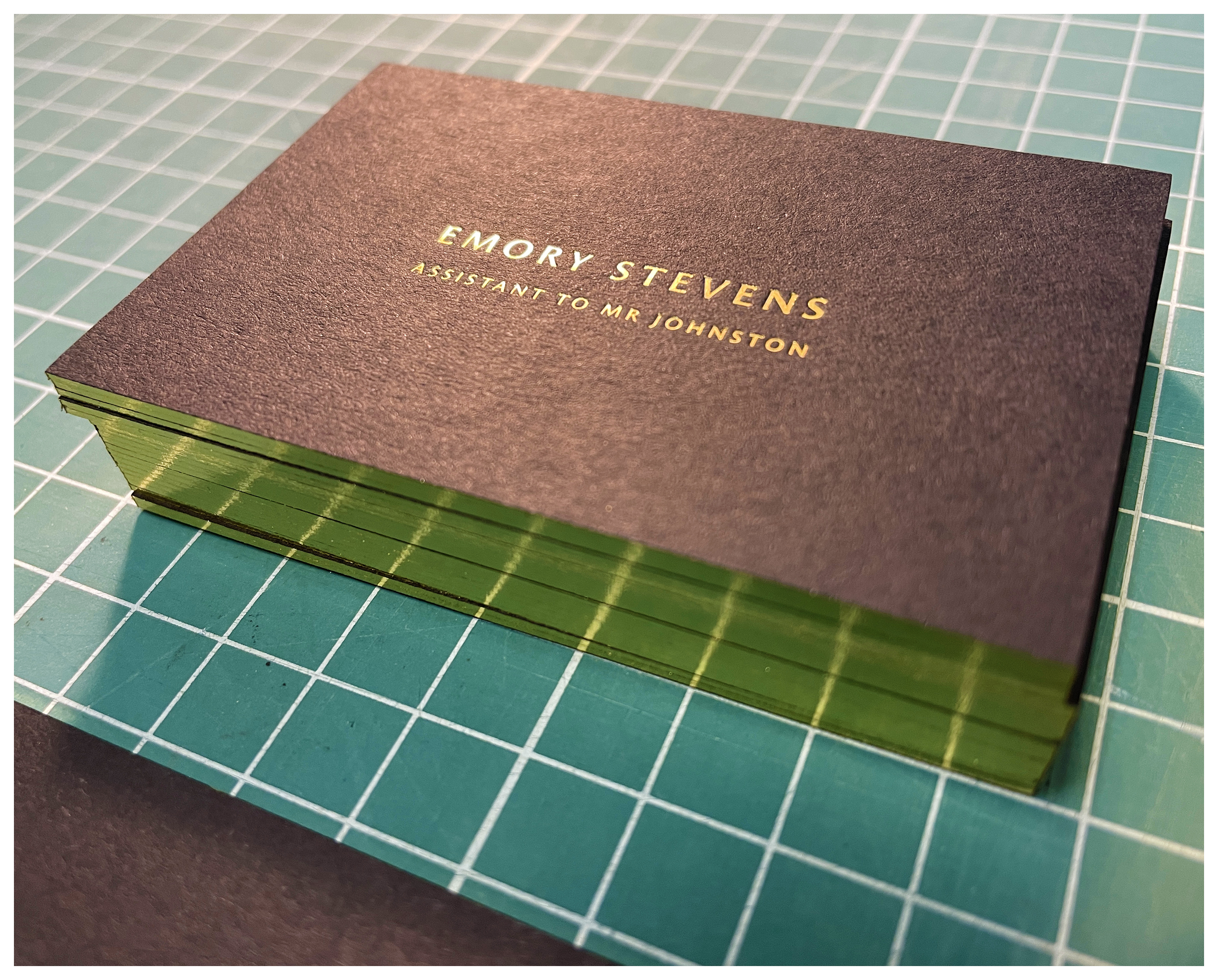 Two options for the Director to choose from on the shoot day; gilt edged black card with gold foil debossed lettering and gilt edged cream card copper die stamped nouveau riche coat of arms with thermography raised black ink.